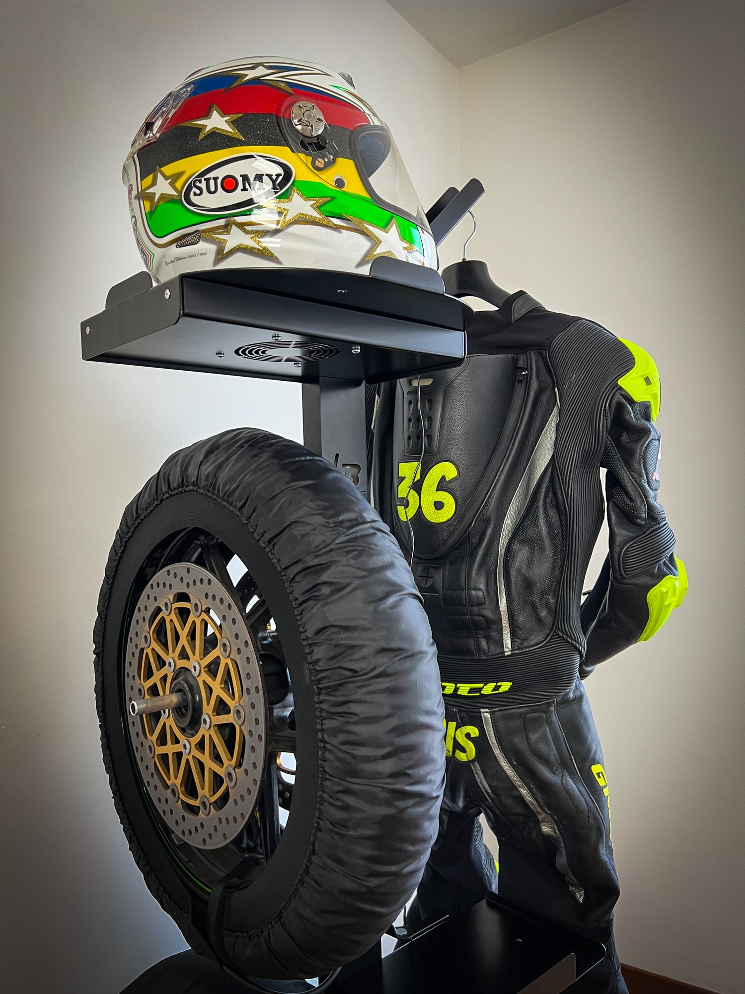 Che sia nel box o sotto al gazebo, 3spolo ti permette di alloggiare comodamente tuta, casco, guanti, stivali e addirittura tenere a portata di mano una coppia di cerchi.